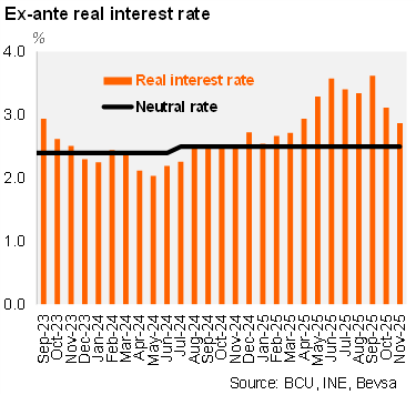 The central bank's statement reiterated that monetary policy is gaining credibility amid historically low inflation expectations. Short-term inflation projections remain stable compared to the previous Copom meeting. Average inflation expectations for the monetary policy horizon (24 months) stand at 4.98% (4.95% in the previous meeting), which is within the tolerance range for the sixth consecutive month. Consequently, we estimate the ex-ante real policy rate at 2.87%, somewhat above the BCU’s neutral real rate estimate of 2.5%.